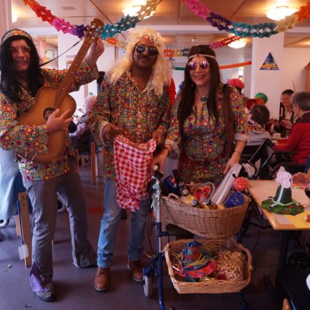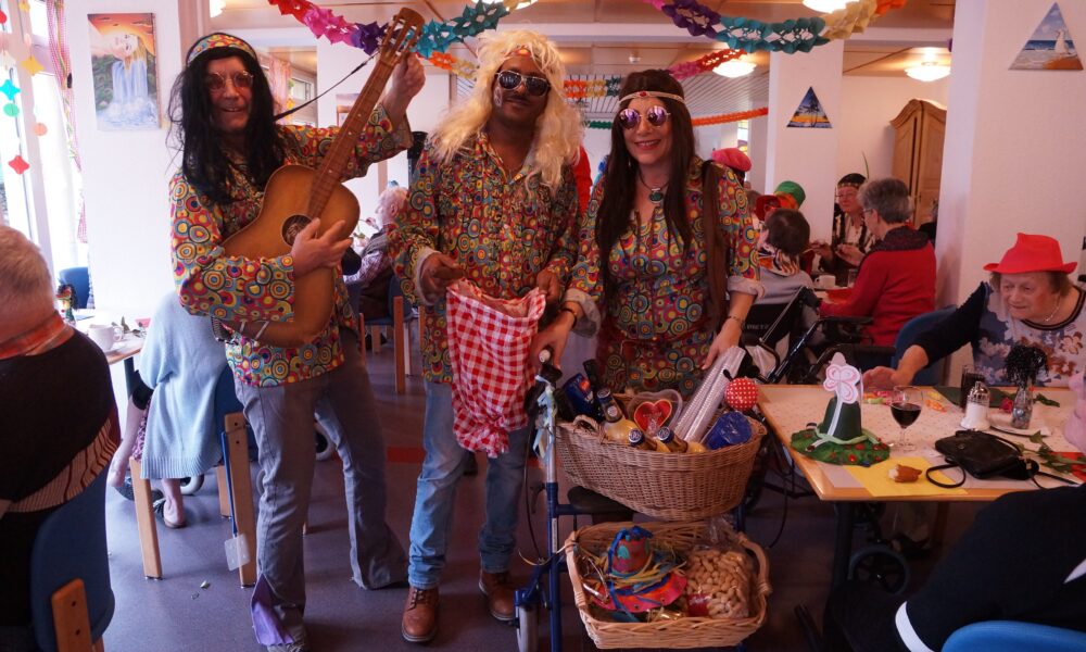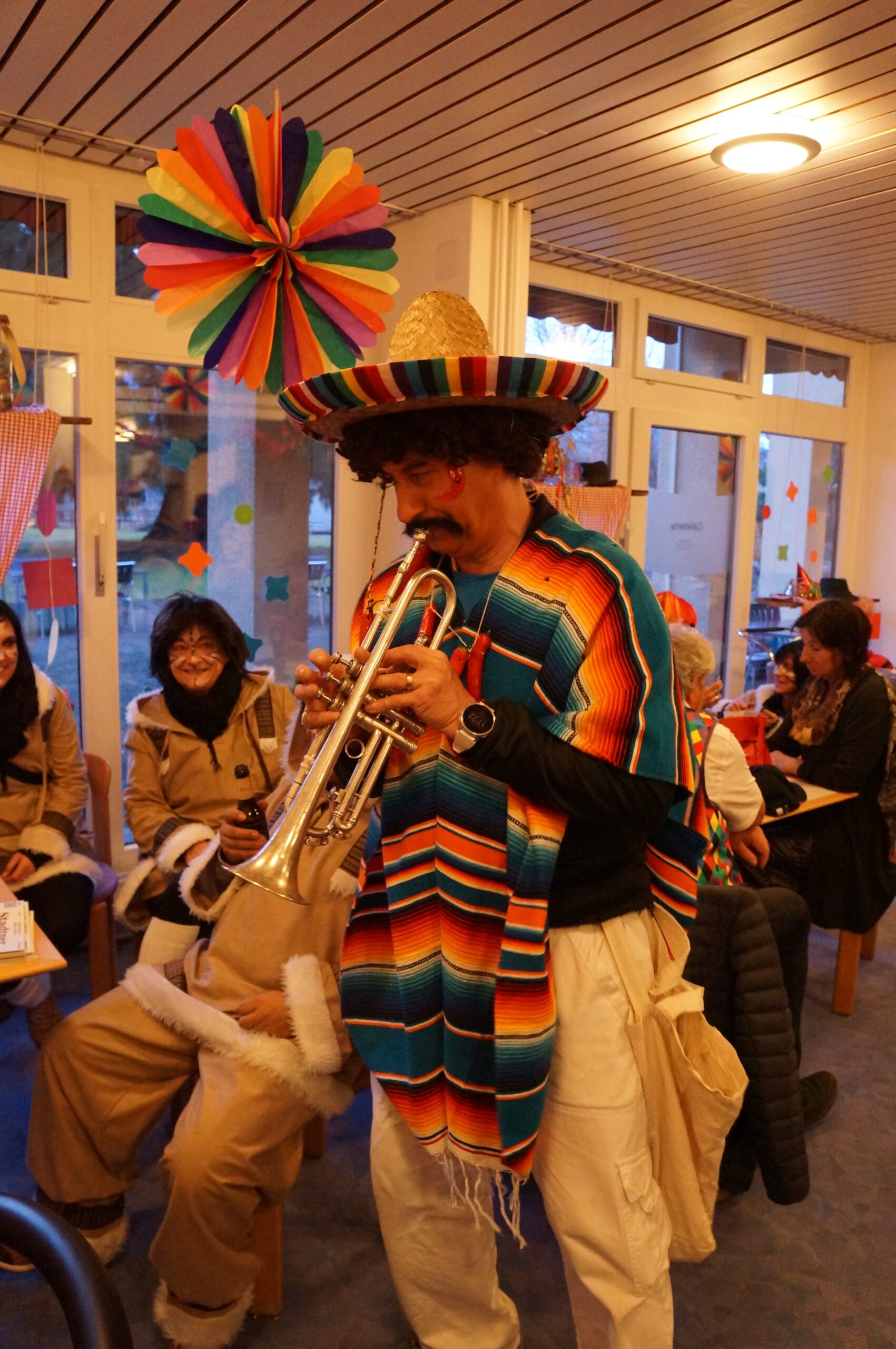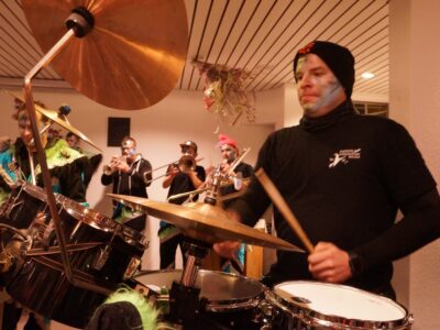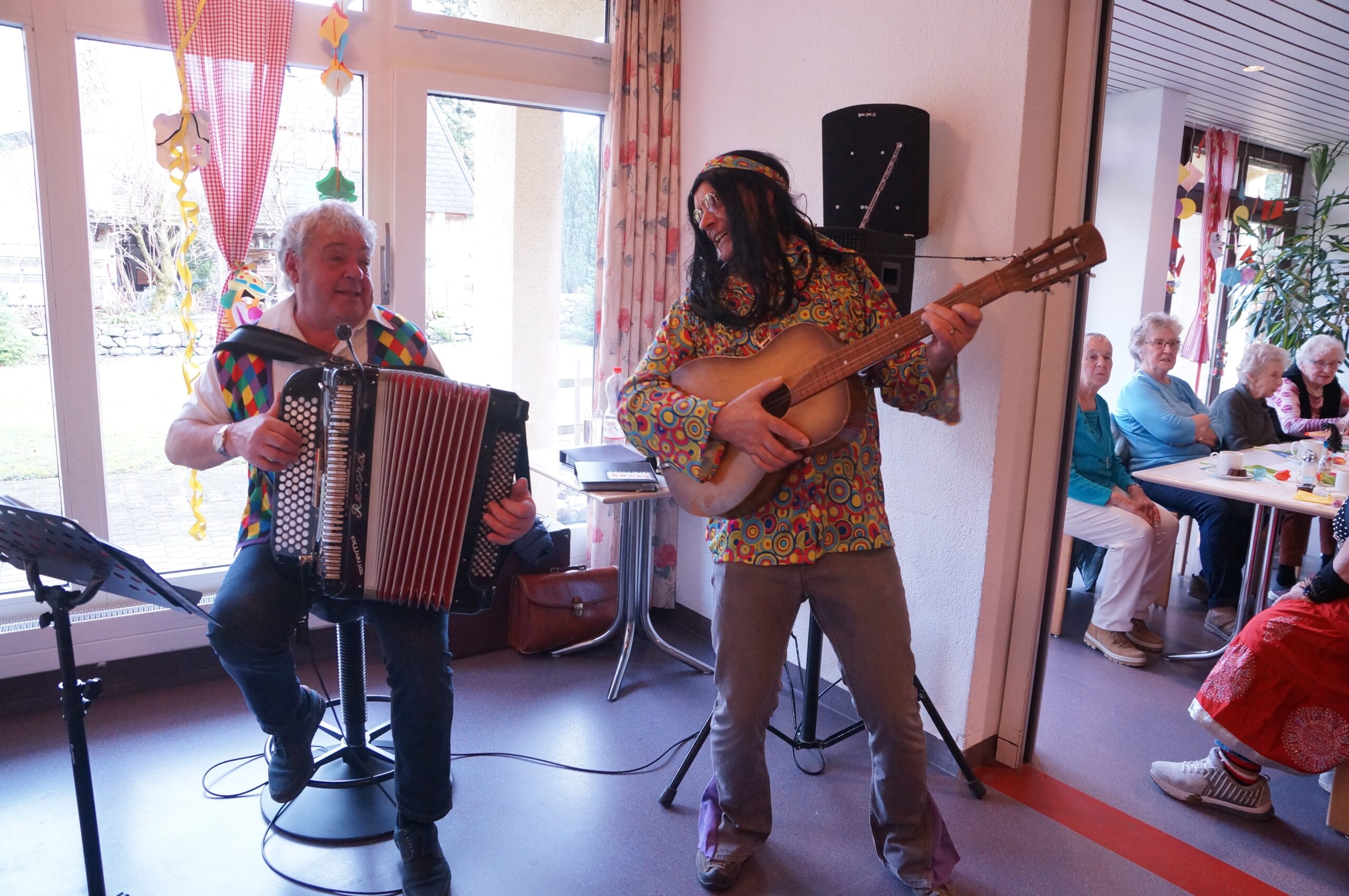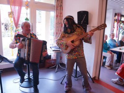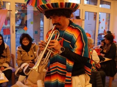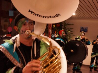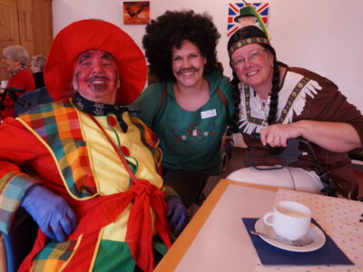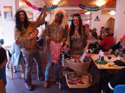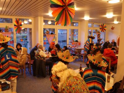 Ab 14.30 Uhr am Schmutzigen Donnerstag sorgte Werni Romer mit seinem Schifferklavier für eine ausgelassene Stimmung bei Kaffee und Fasnachts-Gebäck. Und so mancher (verkleideter oder unverkleideter) Besucher kam vorbei, um das bunte Treiben im APH Riva zu begleiten. Die Feierlichkeiten gingen bis zum Abendessen weiter. Gegen 18.00 Uhr brachten die Guggenmusiker Schattäbachfäger richtig Schwung in unseren Speisesaal!